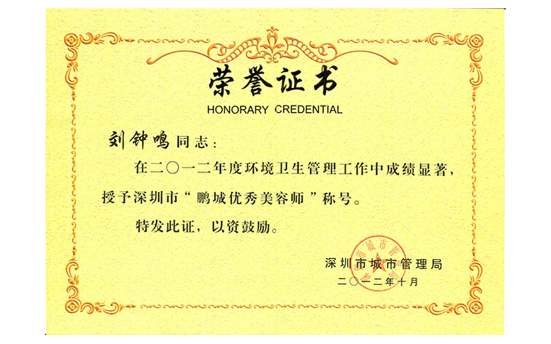 2012年度鹏城优秀美容师(刘钟鸣)
