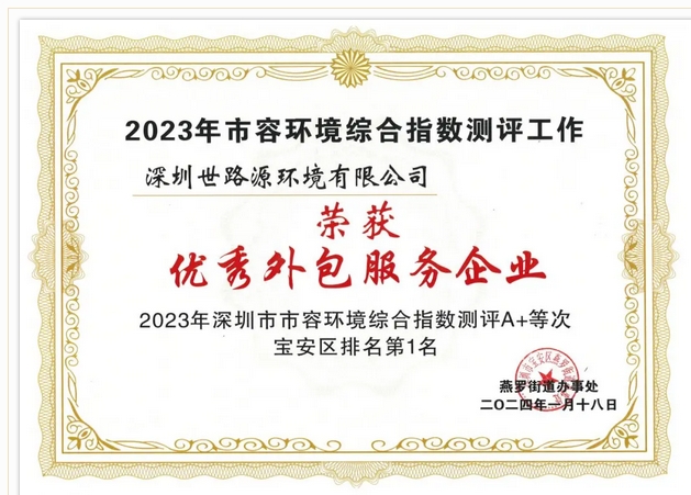2024年1月,世路源环境燕罗公园绿化管养项目凭借优质的服务获得2023年深圳市市容环境综合指数测评A+等级,并于深圳市宝安区整体排名第一。燕罗街道办事处为世路源环境颁发“2023年市容环境综合指数测评工作优秀外包服务企业”荣誉。